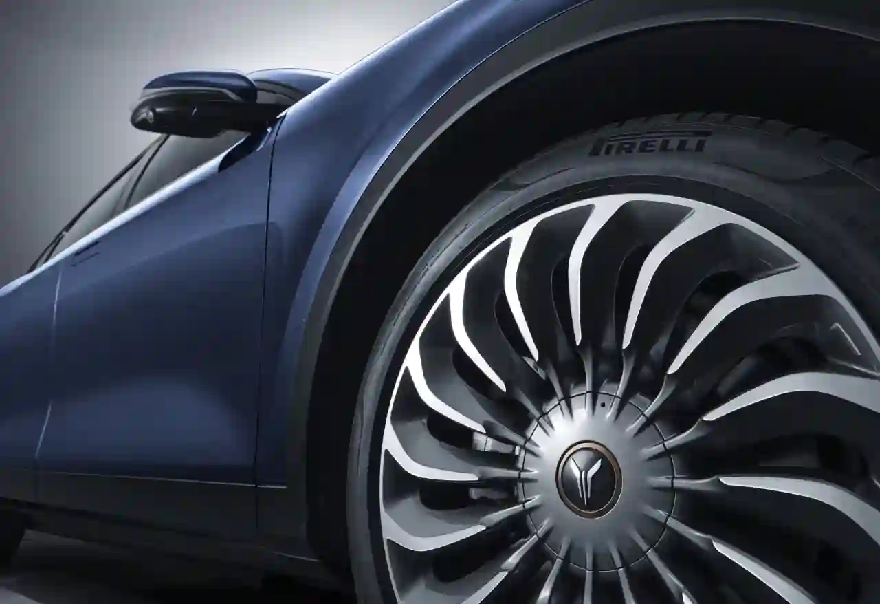 В задней части корпуса, изящная крыша волной ниспадает на мощную корму электромобиля, разделенную светодиодной линией задних фонарей с динамическими указателями поворота. А дополняют образ 20 дюймовые легкосплавные колесные диски, оформленные в стилистике турбин, что усиливает впечатление от яркого характера электромобиля.
