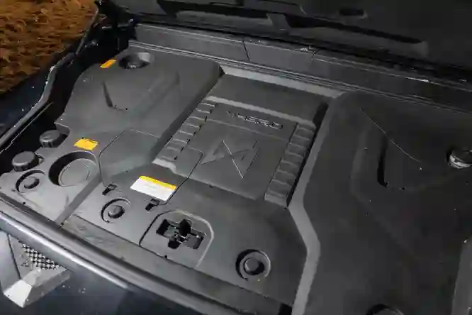 Емкость батареи у гибридной версии M-Hero составляет 56,88 кВт. Не так уж много: запас хода на электротяге приближается всего к 150 км, но в случае с гибридом это и не важно. Однако сделана батарея красиво: она литий-железо-фосфатная и двухслойная – между уровнями ячеек проложены два горизонта PI-пленки жидкостных контуров. Пленка нужна для подогрева, жидкостные контуры – и для подогрева, и для охлаждения. Заключена батарея в алюминиевый корпус с ячеистой структурой стенок, а снизу прикрыта многослойной защитой из алюминия и стали. Вдобавок расположена она внутри рамы, и от внешнего края порога до нее 480 мм. Получается, что и при боковом ударе батарее мало что угрожает.
