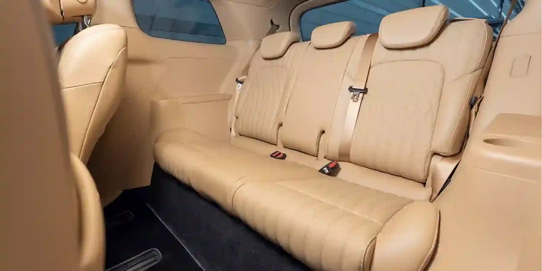 Второй ряд — это два отдельных кресла с оттоманками, подогревом, вентиляцией и даже массажем (все режимы включаются физическими кнопками). Для всех направлений предусмотрены электрорегулировки за исключением продольного. Двигать сиденья вперед-назад придется вручную, что не так уж и просто, потому что они тяжеленные. Полностью откинуть спинки тоже нельзя, и забраться на третий ряд можно только протиснувшись посередине, между креслами второго ряда, пригнувшись и задевая ногами за подлокотники.
